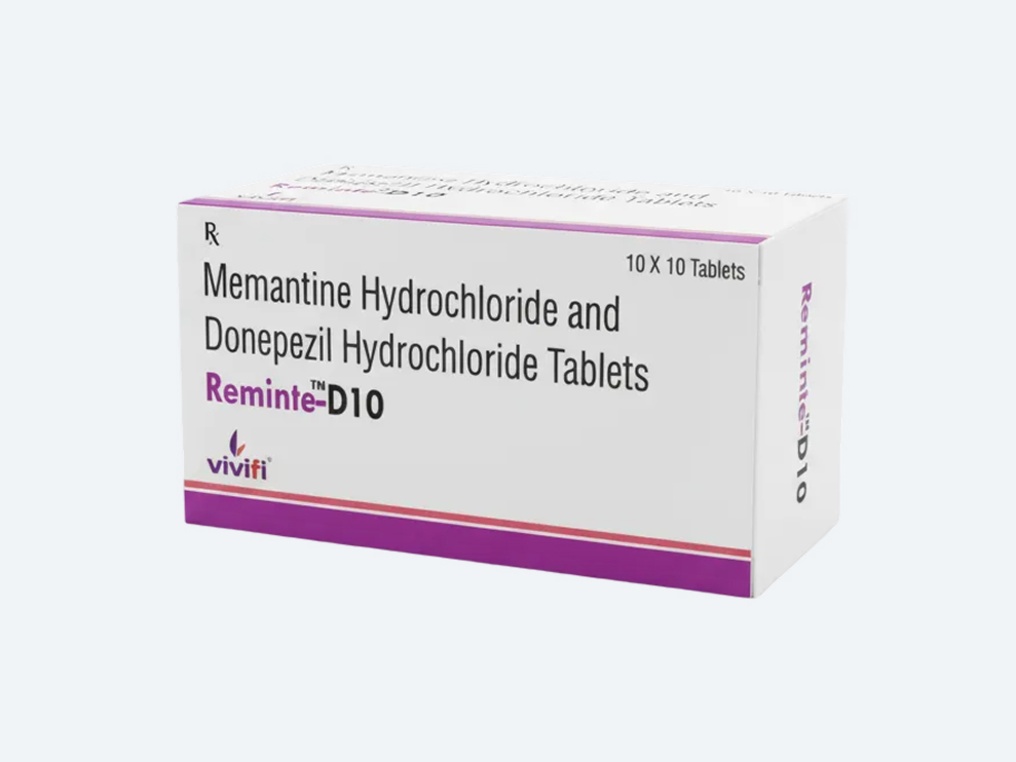 Reminte-D10 Tablet is a medicine used in the treatment of Alzheimer's disease. It helps to slow down the progression of moderate to severe Alzheimer's disease by improving memory and thinking. This medicine works by blocking a chemical messenger involved in the transmission of nerve signals.