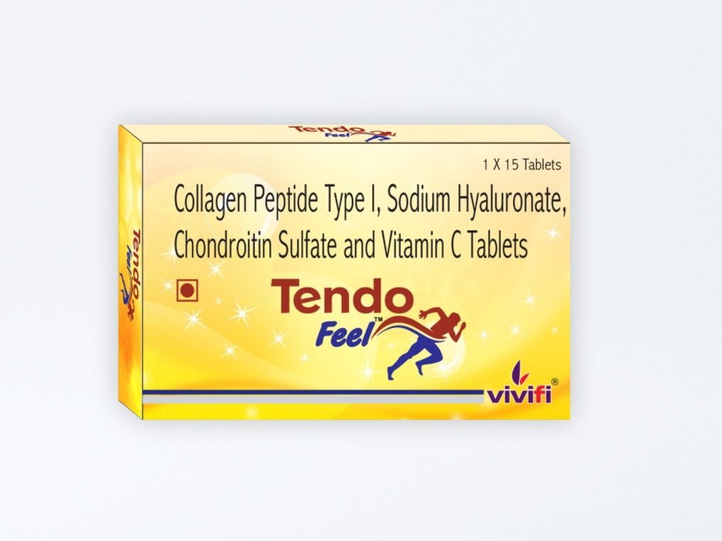Tendofeel Tablet is a supplement tablet that contains a blend of ingredients like collagen peptide type 1, sodium hyaluronate, chondroitin, and Vitamin C. It is used to support joint health by helping with pain, inflammation, and the building of connective tissues, and can also be used for improving skin and muscle strength.