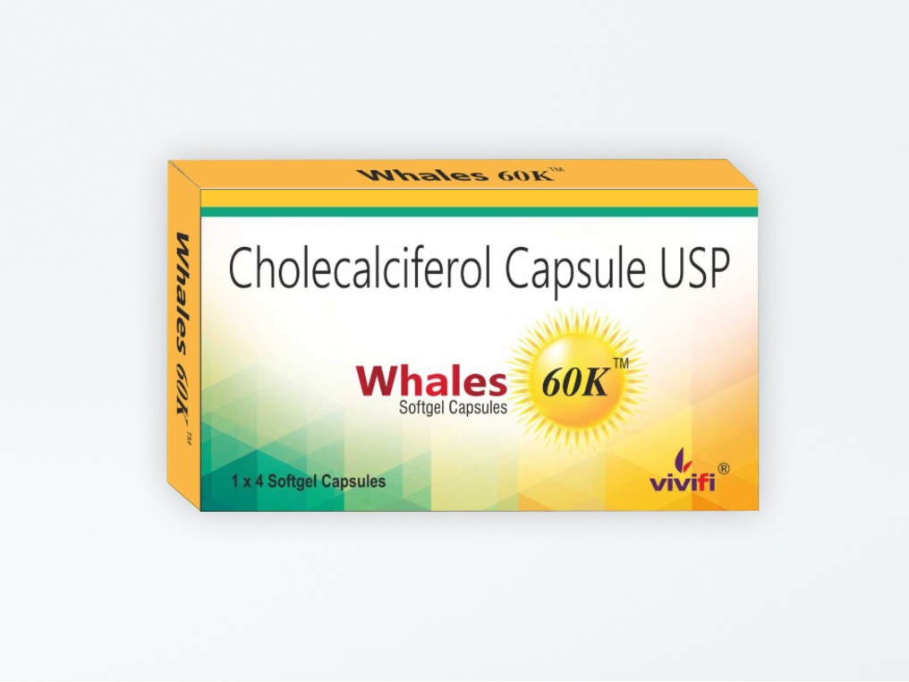 Whales 60K Softgel Capsule is used in the treatment of vitamin D deficiency and osteoporosis. It helps the body to absorb calcium. Calcium is essential for maintaining strong and healthy bones. It is used when your diet does not provide enough calcium.